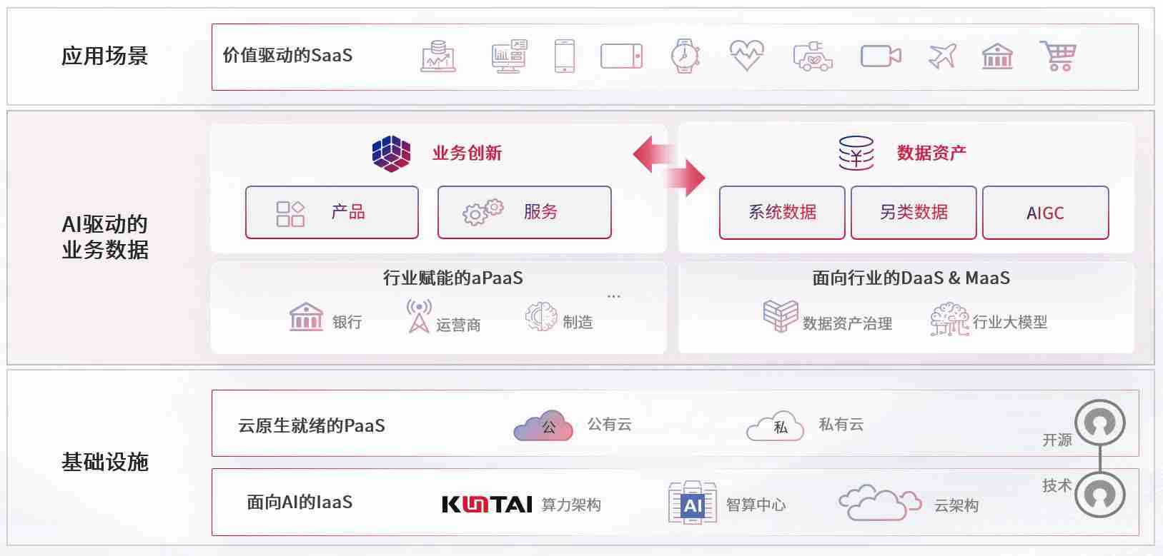 数字时代,,围绕企业数字化转型的关键要素,,NG娱乐数码开创性的提出数云融合战略和技术体系框架,,,着力在云原生、、数字原生、、、、AI原生和信创产业上架构产品和服务能力,,,为处在不同数字化转型阶段的快消零售、、、、汽车、、、、金融、、医疗、、、、政企、、、、教育、、、、运营商等行业客户提供泛在的敏捷IT能力和融合的数据驱动能力,,构建跨界融合创新的数字业务场景和新业务模式,,,,助力企业级客户建立面向未来的核心能力和竞争优势,,全面推动社会的数字化、、智能化转型升级。。。。
